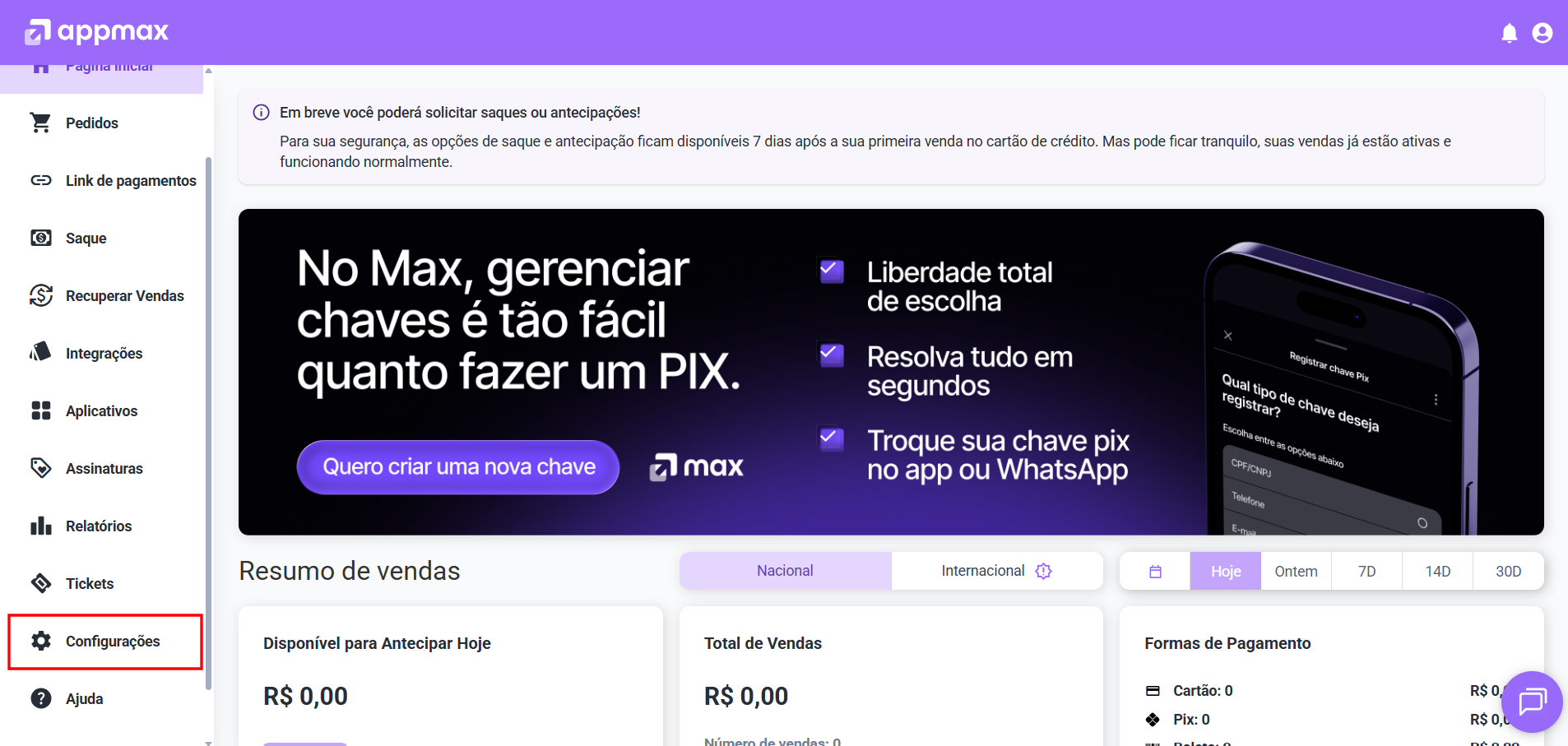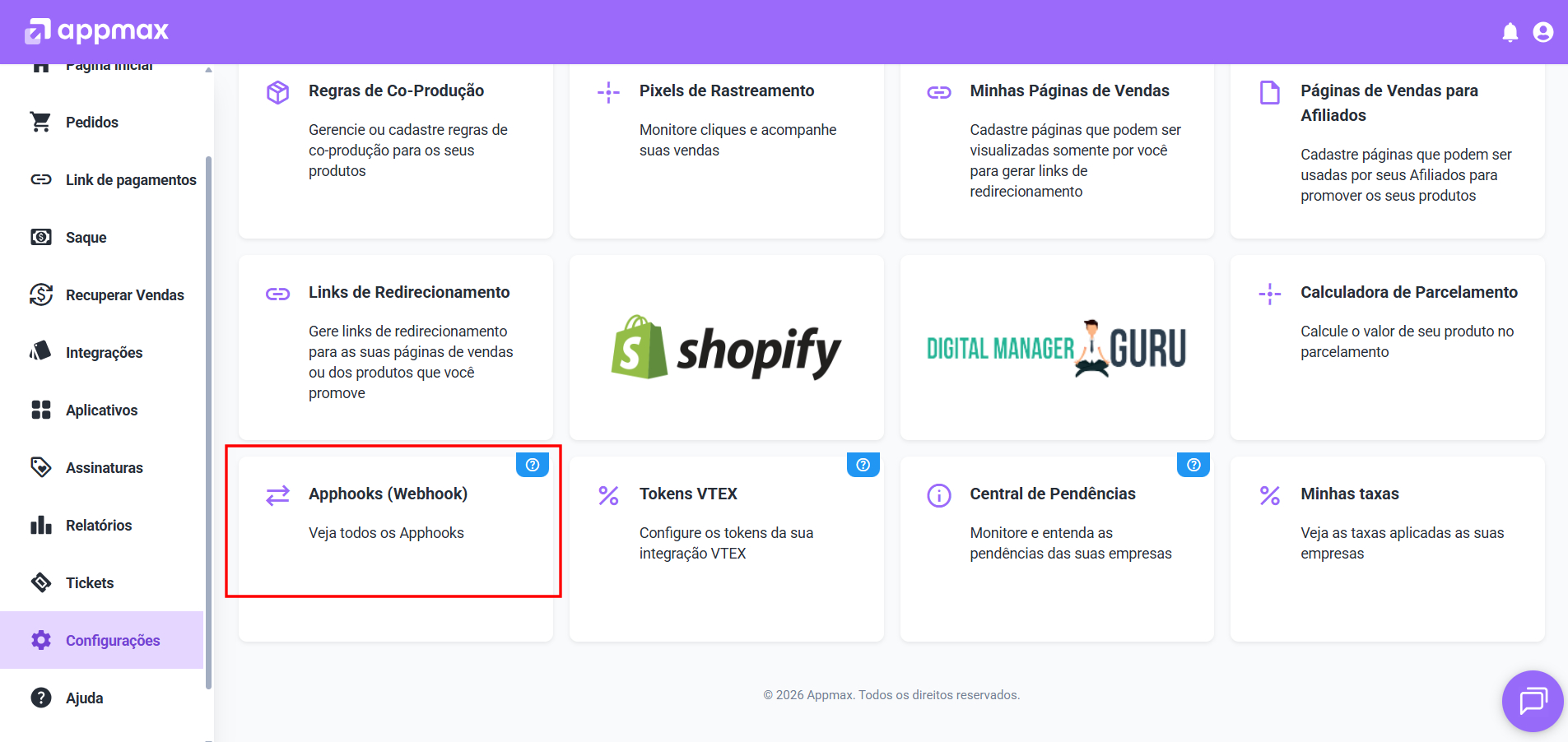 Depois de acessar a plataforma da Appmax você deve clicar em “Configurações”, assim como indicado em vermelho.