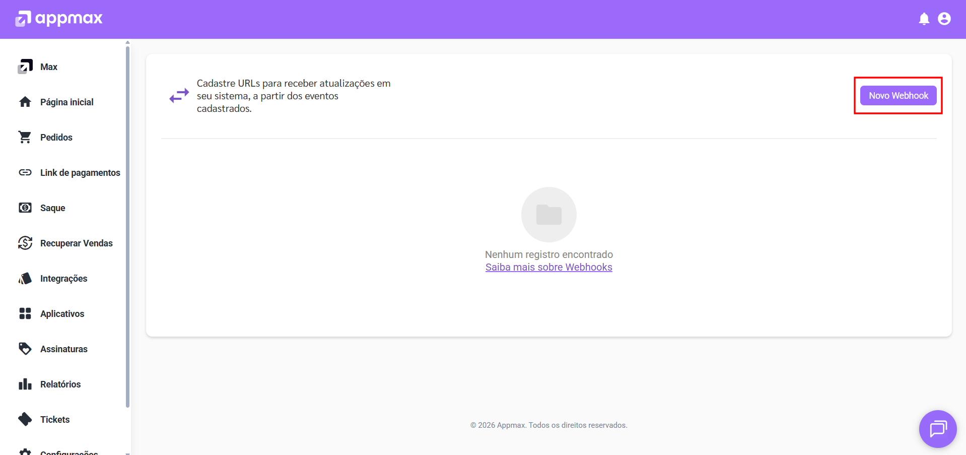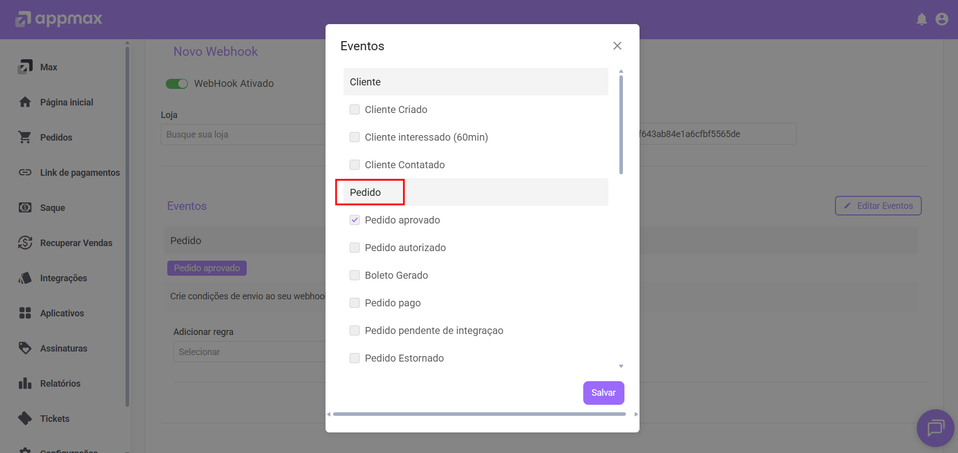 Depois de preencher todos os campos, clique em “GERAR URL WEBHOOK” após o link ser gerado vamos copiá-lo e nos direcionar a plataforma da Appmax.