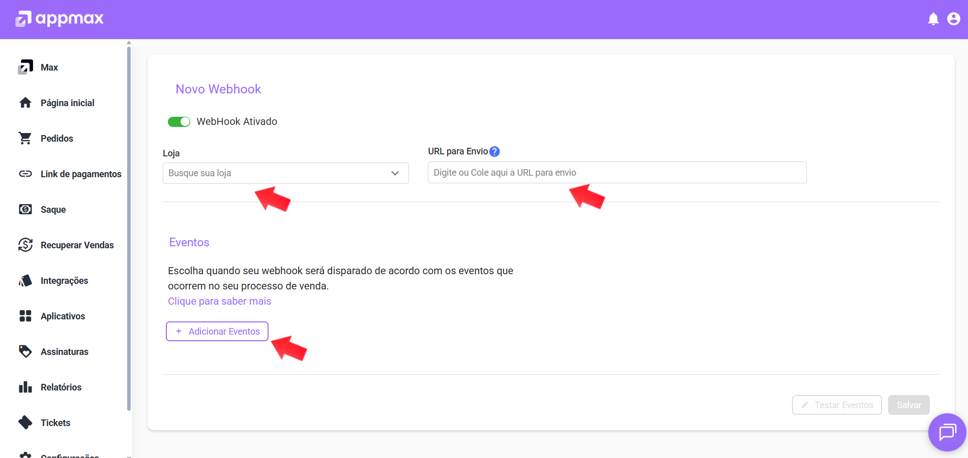 • Eventos: Campo no qual você vai adicionar quais eventos você quer que a sua notificação seja enviada.