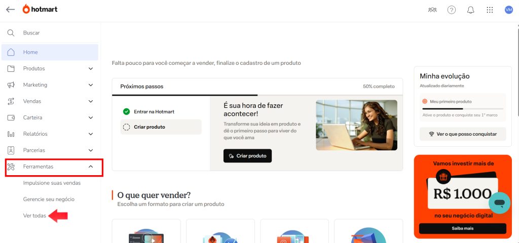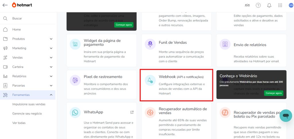 Agora vamos acessar a plataforma Hotmart e no menu esquerdo clicar em “Ferramentas”, depois em “Ver todas” e vamos rolar o mouse até encontrar “Webhook (API e notificações)”.
