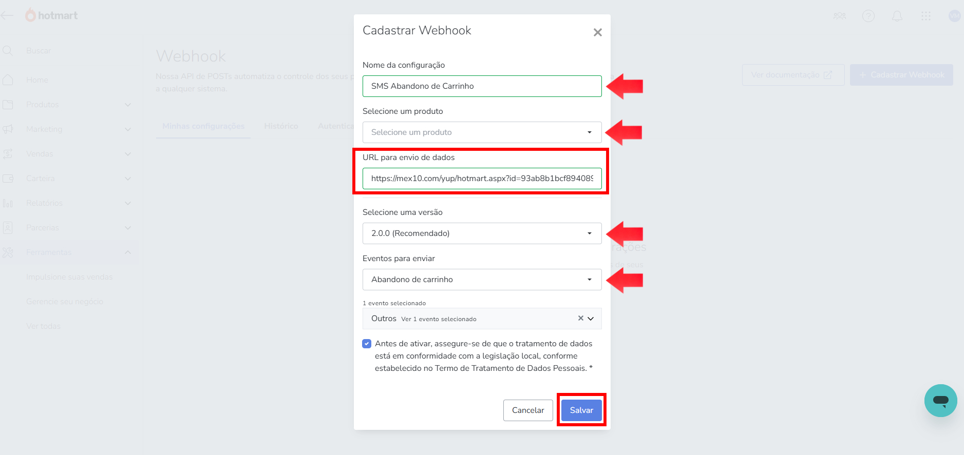 No campo apontado pela seta vermelha, vamos colar as informações da URL que copiamos na plataforma Mex10 e depois clicar em Salvar.