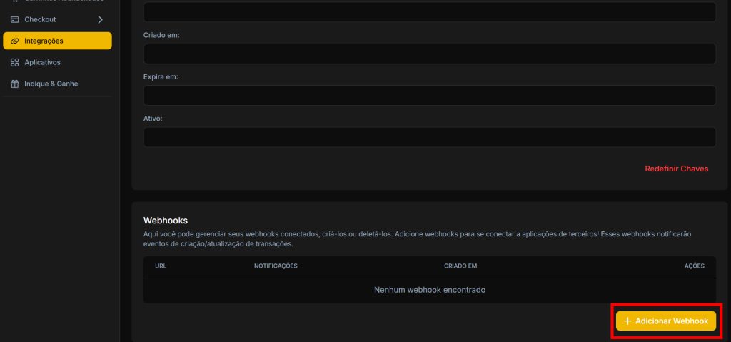 Agora precisamos precisamos adicionar o nosso Webhook, para adicioná-lo vamos clicar no botão “Adicionar Webhook”, no final da página.